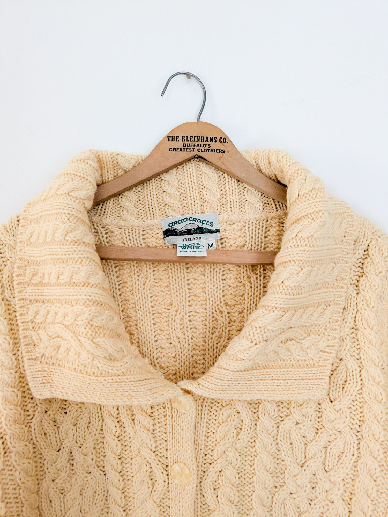 80s-90s cream colored wool cardigan sweater. Tiny mend at front. Shown on an xs but will fit up to a large.