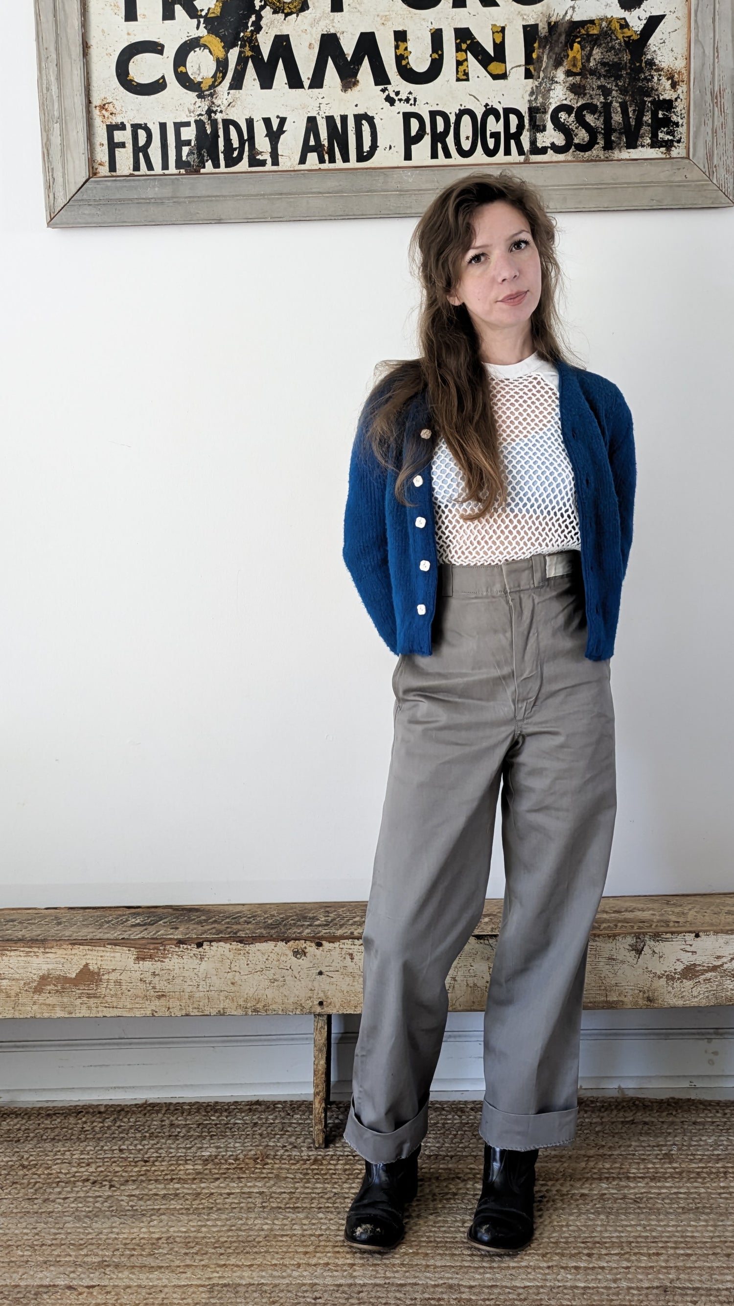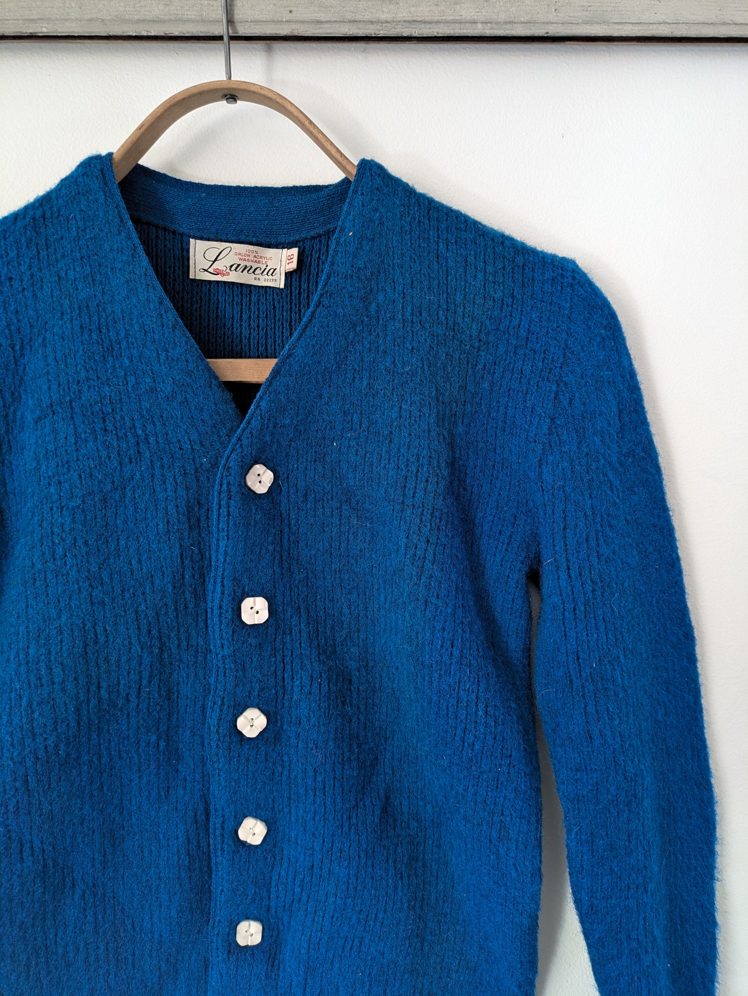 60s deep blue acrylic faux mohair cardigan sweater. Slight fade at chest.