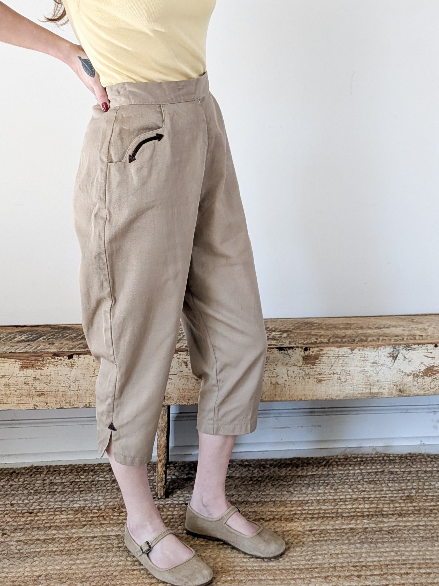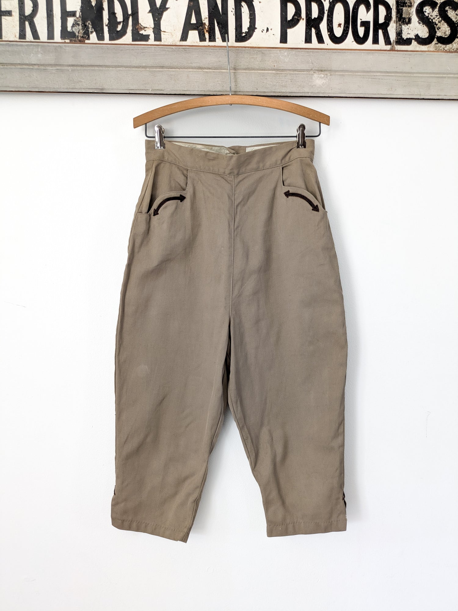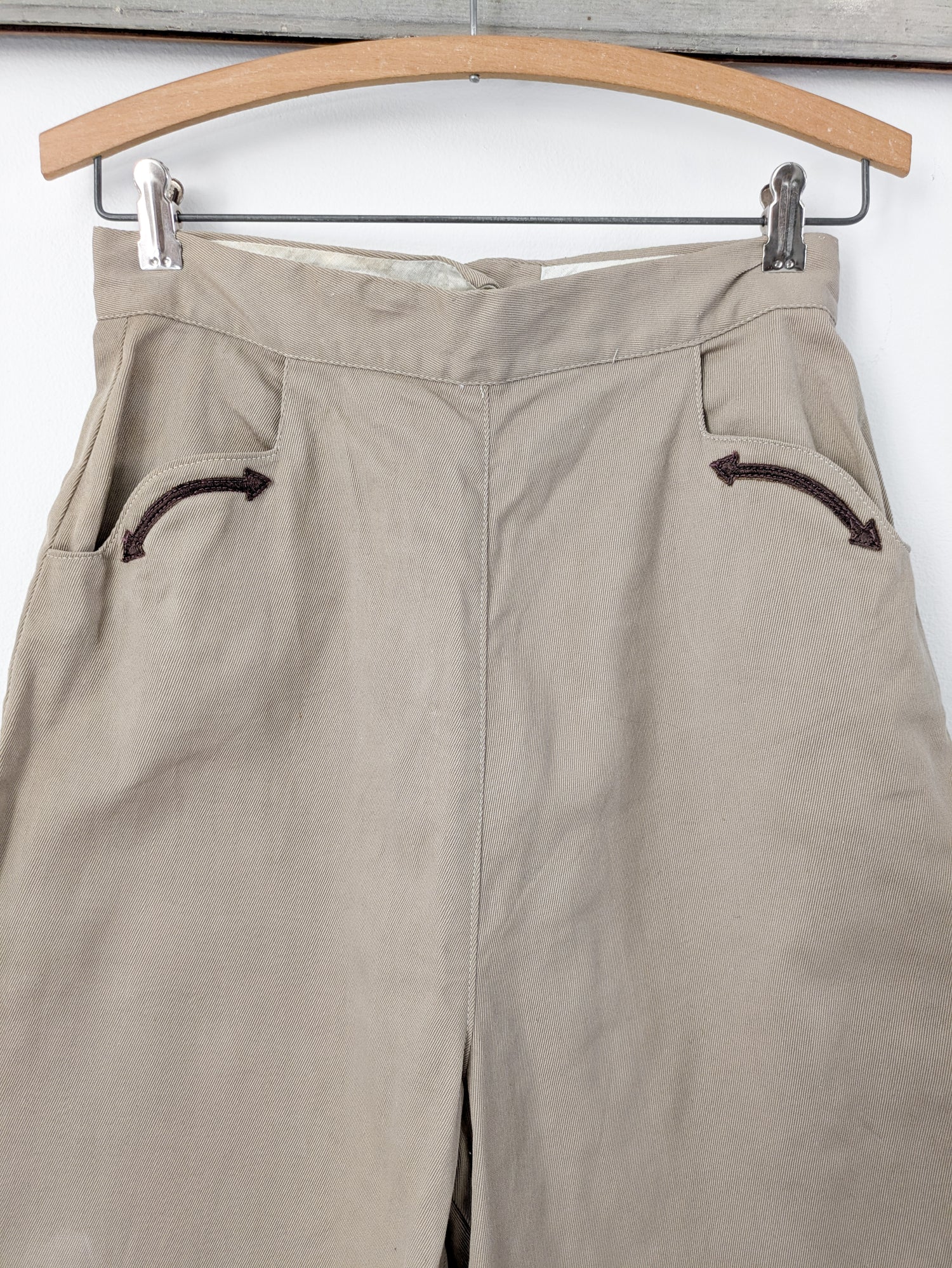 Unworn (but washed and air dried) pair of 40s/50s all cotton tan cropped pants with Western embroidery at pockets and ankles. Slight circular faded area at ankle.